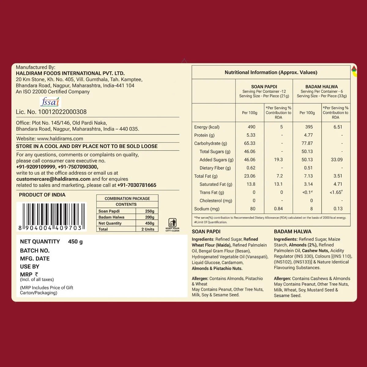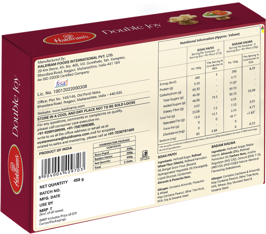 Double Joy is a Haldiram's Sweets Combo that gives you double the fun! Enjoy the mouth-watering combination of delectable Soan Papadi and luscious Badam Halwa in one awesome and festive package!